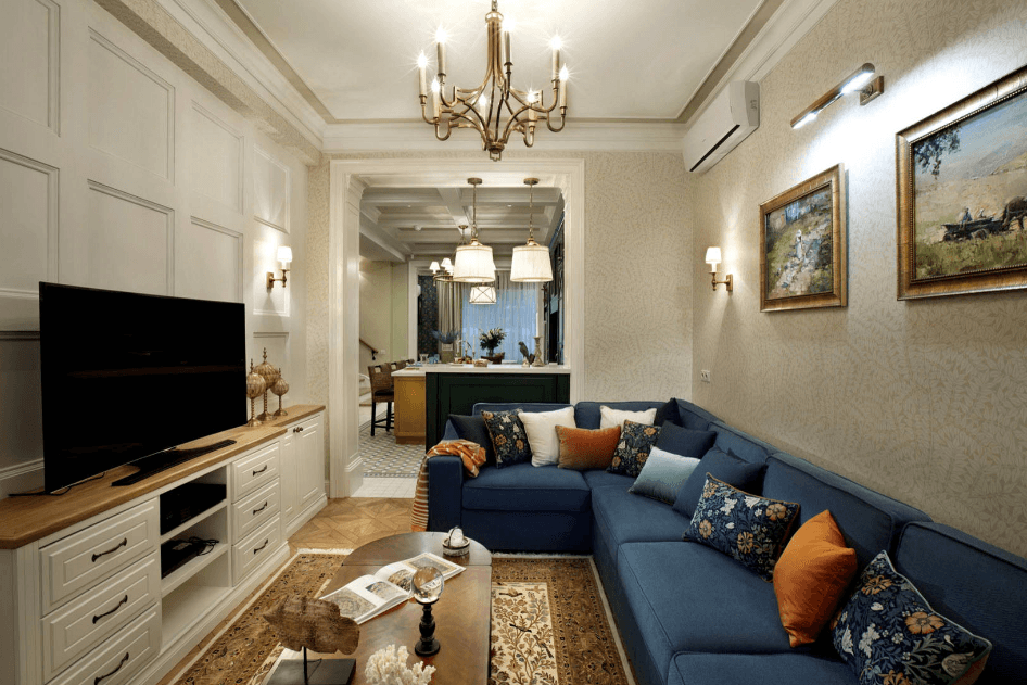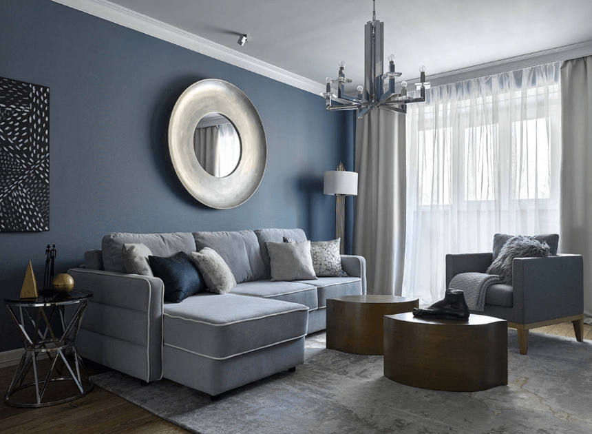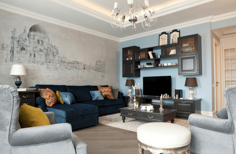 Палитра оттенков синего цвета будет актуальной, как никогда раньше. Ведь именно такие тона великолепно подходят для оформления гостиной. Смотрится это довольно лаконично, но в то же время стильно. Поэтому многие дизайнеры рекомендуют в качестве основного цвета обоев выбирать пастельный голубой. Если же вы хотите комбинированный вариант, то можно использовать и более яркие оттенки или же с подходящим рисунком. Они придают интерьеру живости и при этом делают гостиную более изысканной.