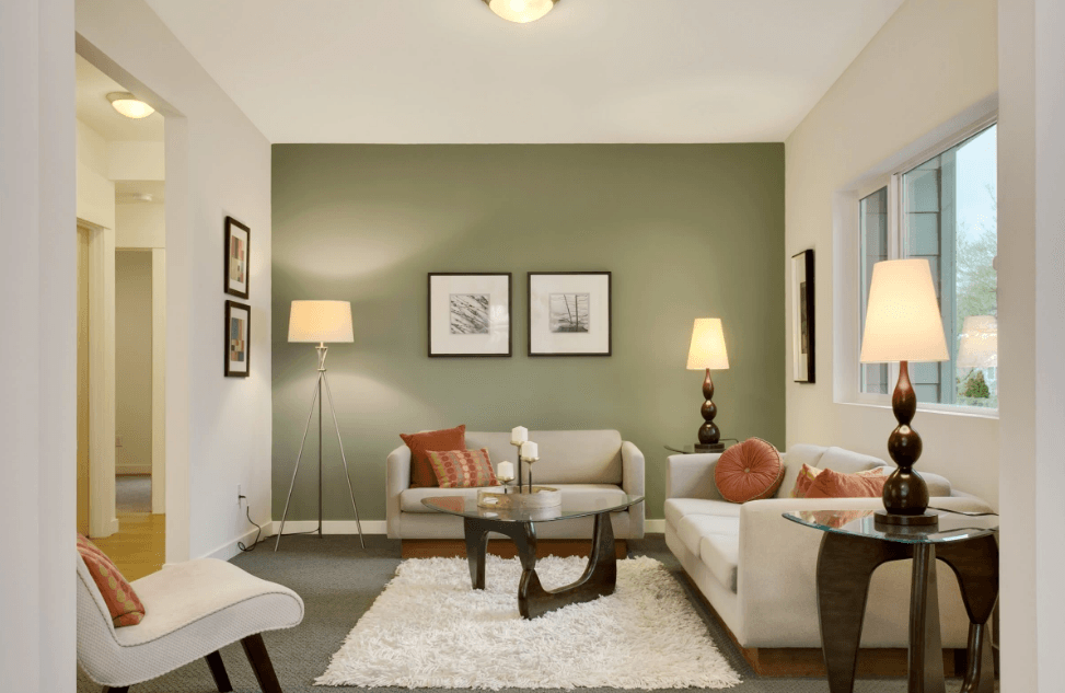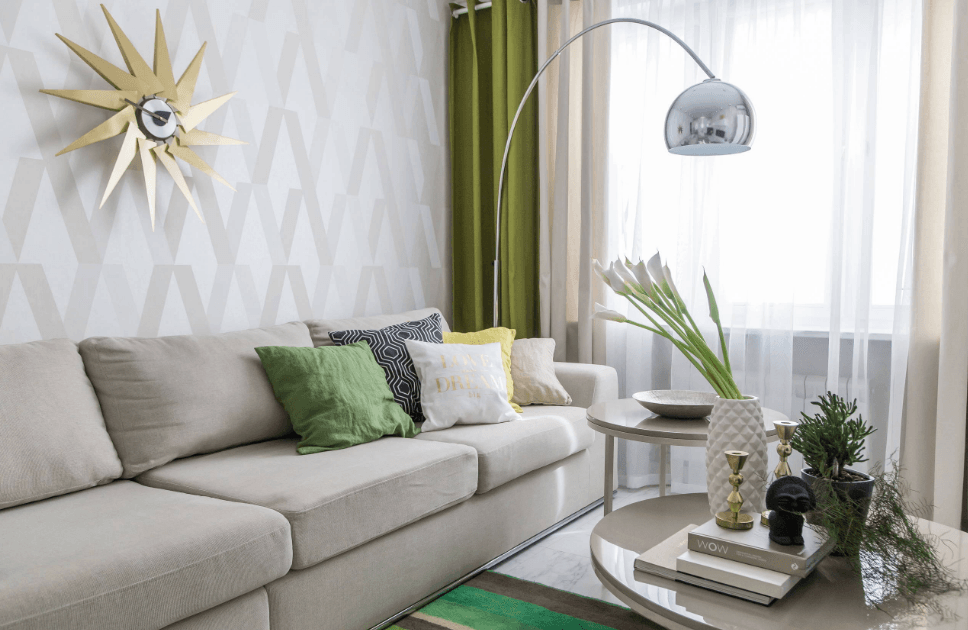 В числе самых актуальных оттенков 2018 года будет зеленый цвет. Именно он является своеобразным напоминанием об экологичности, поэтому его выбирают для дизайна гостиной довольно часто. Что касается обоев, то рекомендуем присмотреться к пастельному или приглушенному оттенку зеленого. Дело в том, что они будут смотреться более сдержанно, но в то же время мягко. Поэтому при желании можно сделать комбинированный вариант из обоев зеленого и белого или бежевого цвета.