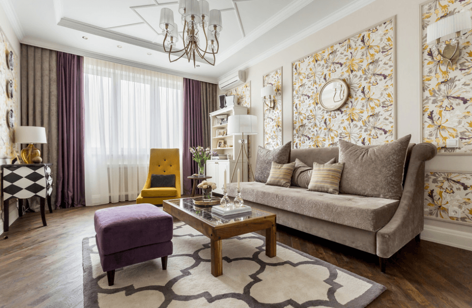 Изучив удачные цветовые и видовые сочетания, комбинируем обои разных стилей в зале.
