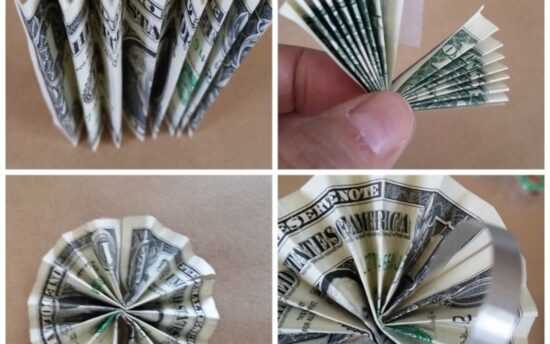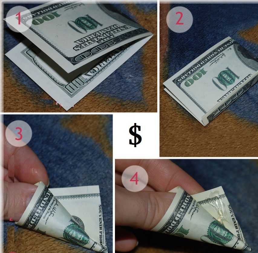 На фото ниже показано, как я сворачивала купюры. Таким методом дерево получается максимально пышным и высоким. В среднем у меня ушло чуть больше 30 таких бумажек.