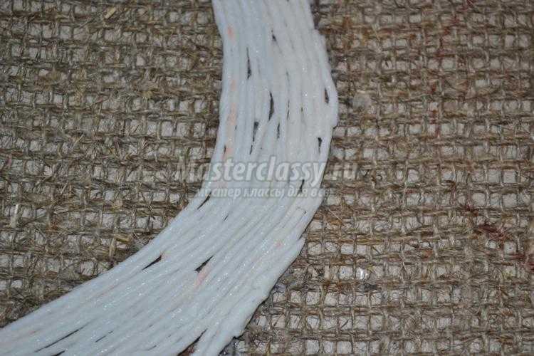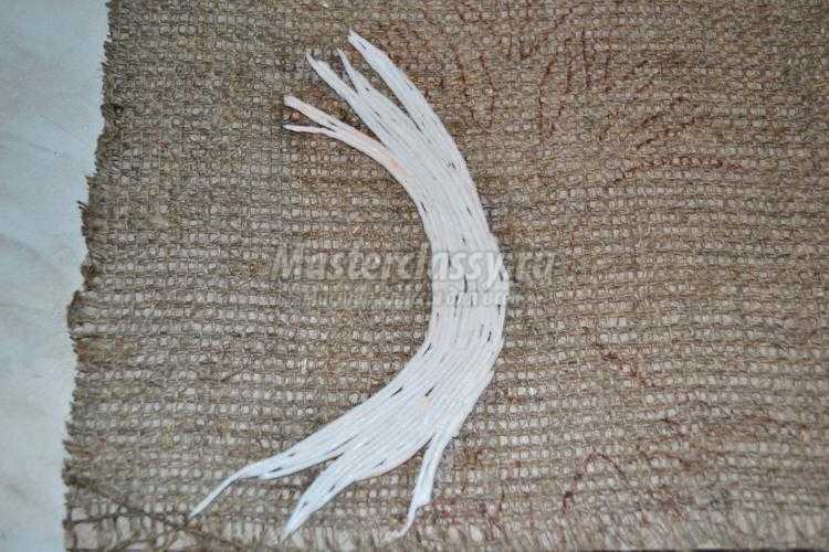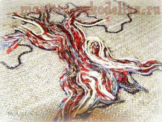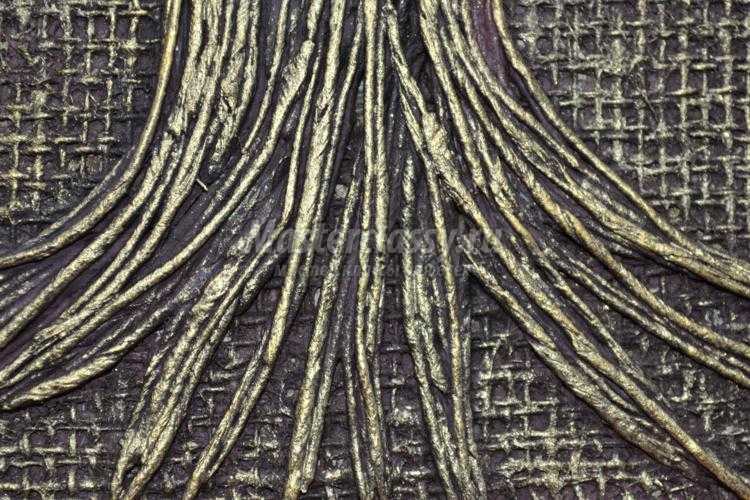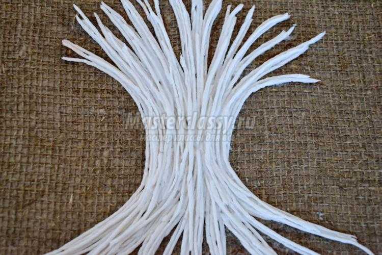 Теперь можно приступить к самой сложной и ответственной части работы – формированию ствола денежного дерева. С помощью клея ПВА, в достаточном количестве нанесенного на мешковину, нужно приклеить жгутики из салфеток (отрезки веревки или шнурка), стараясь не выходить за контуры рисунка. Между заготовками не должно быть расстояния. Для получения более интересного рисунка можно изгибать, скручивать и перекрещивать заготовки, стремясь к имитации коры настоящего дерева.