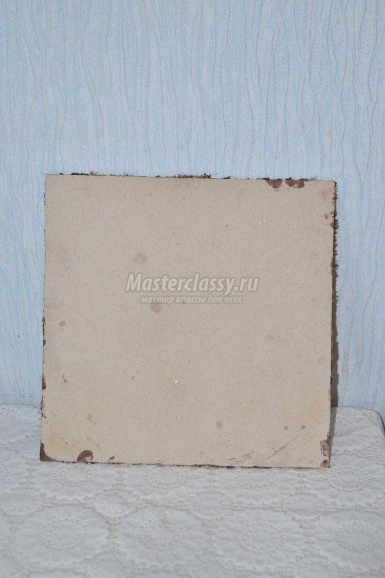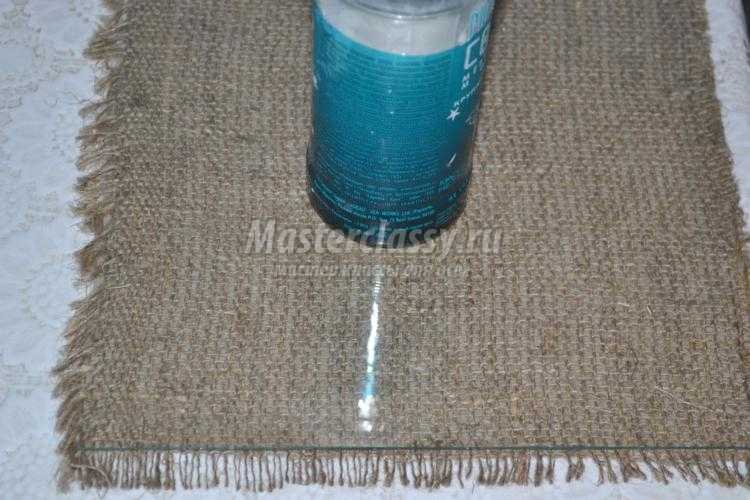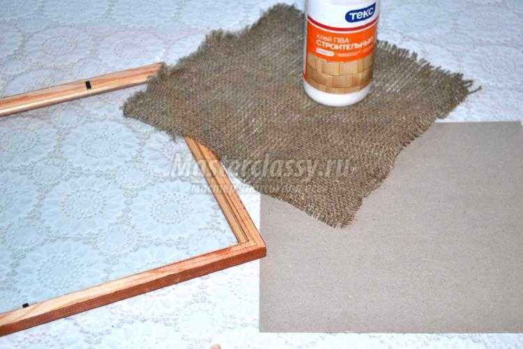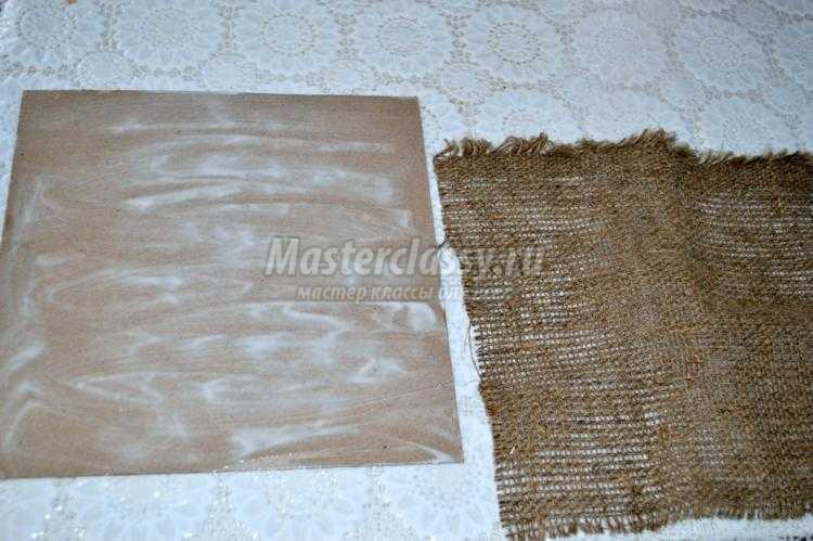 - На картон нанести достаточное количество клея ПВА и приклеить мешковину к картонной заготовке, плотно прижимая по всей поверхности и не допуская возникновения пузырей.