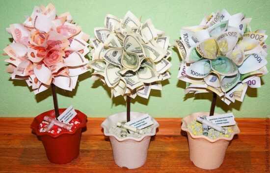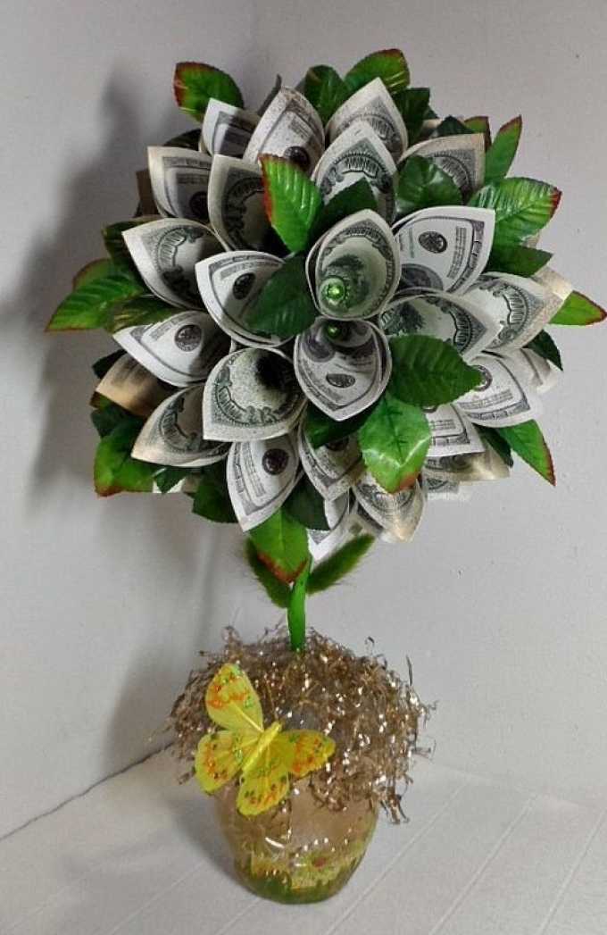 Такие искренние слова и эксклюзивный подарок дерева счастья не оставят никого равнодушным. Топиарий из денежных купюр будет желанным и весьма эффектным подарком для любого.