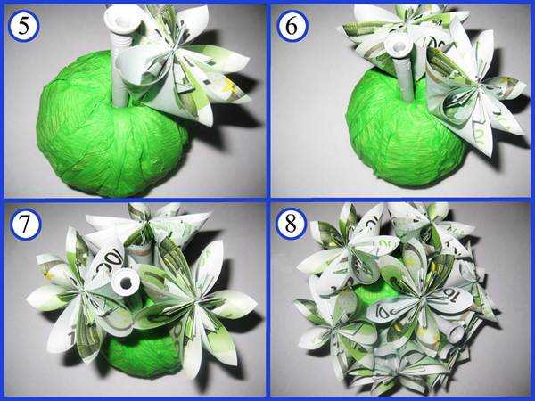 На стебле закрепляем пенопластовый шар. Шар украшаем купюрами и различным декором: бусинами, пайетками и т.п. Всем, что подскажет вам богатая фантазия.