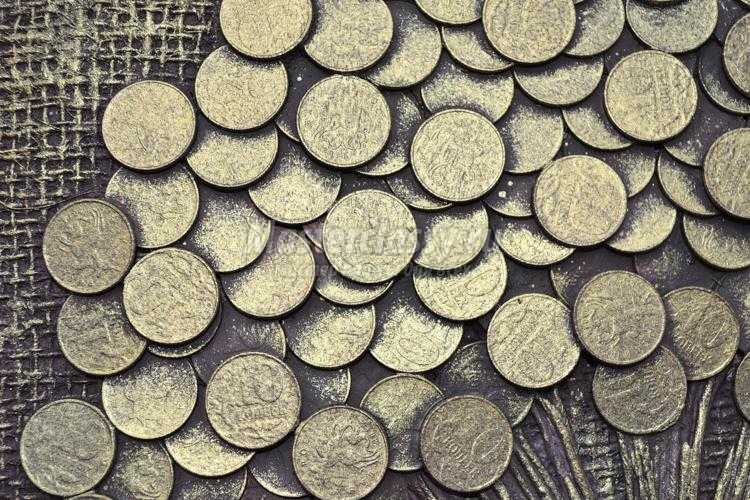 - Сухую губку обмакните в золотистый цвет, нанесите краску на монеты и растушуйте. Еще влажную от краски поверхность монет обработайте блеском. Оставьте полотно до полного высыхания.