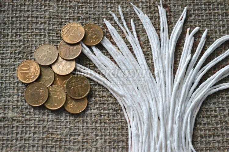 - Привяжите к монетам отрезки медной проволоки. Подходящий диаметр – 0.3 мм.