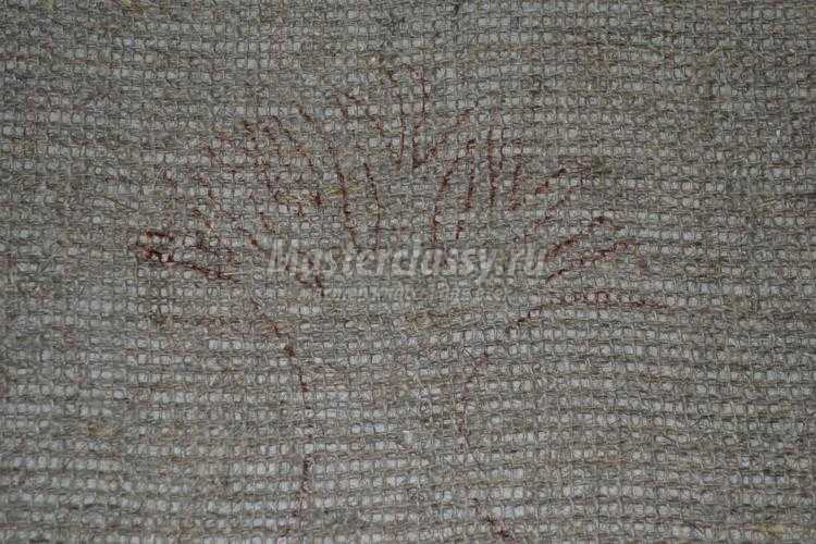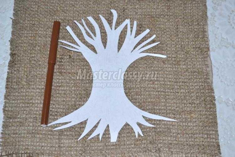 На высохшую мешковину с помощью простого карандаша нанести контуры будущего дерева. Крону желательно нарисовать максимально простой формы, ведь она будет заполняться монетами, и сложный рисунок просто не получится. А вот со стволом дерева можно проявить фантазию: сделать его изогнутым, выделить отдельные ветки или мощные переплетенные корни.