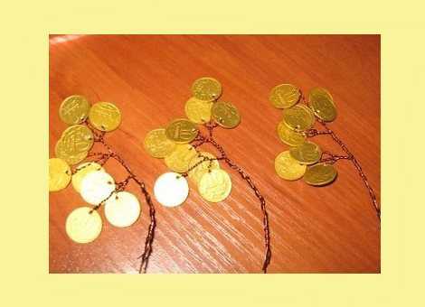 Монетки для дерева-талисмана можно брать настоящие (одного размера), но, учитывая их достаточно большой вес, – нужно использовать для ветвей прочную жесткую поволоку. К тому же, в настоящих монетках нужно заранее просверлить (дрелью) дырочки. Если же используются облегченные декоративные монетки (с готовыми отверстиями) – подойдет тонкий вид проволоки.