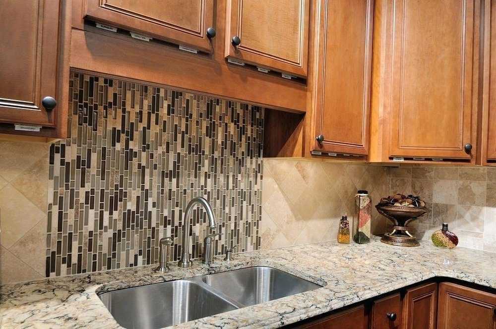Самый современный вариант: фартук из плитки, имитирующей мозаику. Она не имеет краев, и ею можно облицевать любую требуемую площадь