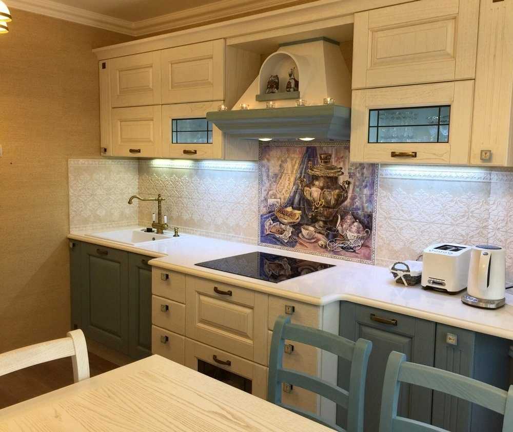 Необычный вариант мозаичного панно на фартуке кантри-кухни