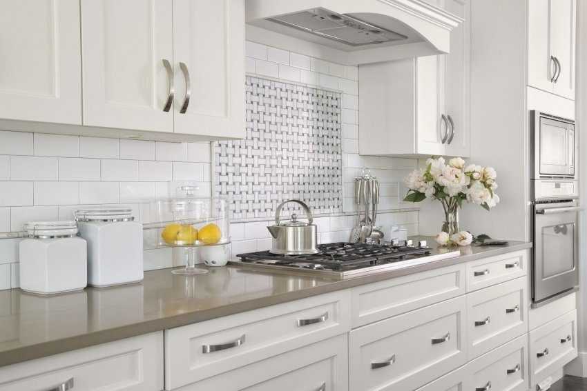 Чтобы белая плитка панно динамично смотрелась на кухонном фартуке, необходимо подобрать гарнитур контрастного цвета – с темными или яркими фасадами. Синхронно будет перекликаться между собой белоснежный кафель с витиеватыми узорами, отображающими облик вьющихся цветов, и гарнитур с фасадами, украшенными филенками с типажным декором. Белое панно из плитки на кухню для фартука актуально выбрать для облицовки комнаты, выполненной в духе классики, прованса и современных направлений дизайна.