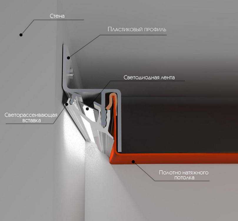 - местом для подсветки, которое скрывается за натяжным полотном.