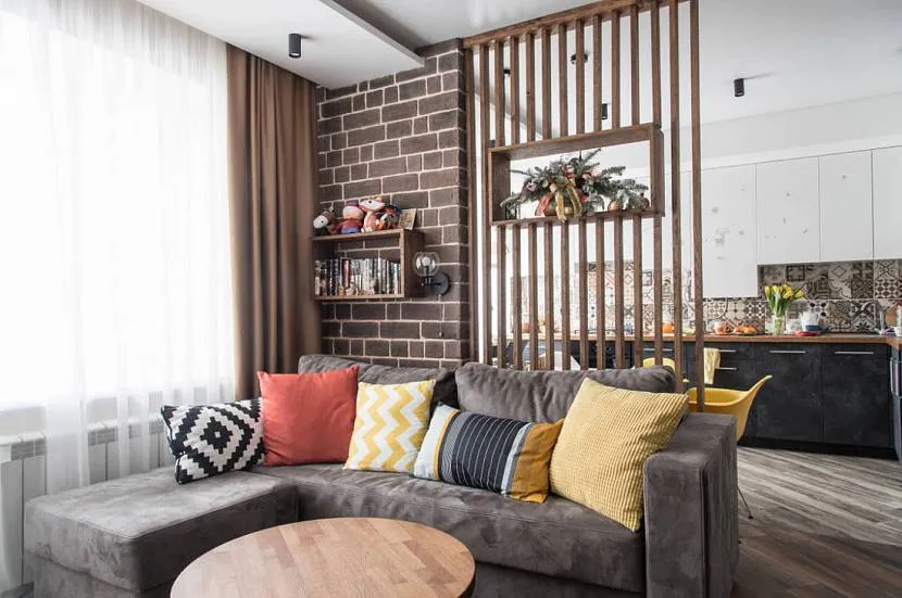 Достаточно простым и бюджетным вариантом является реечная перегородка. Вертикально установленные деревянные рейки или балки могут стать отличным декором для современного интерьера. Они подчеркнут границу зоны, но не разделят комнату полностью.