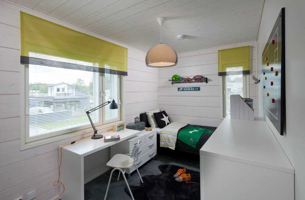 Самое большое преимущество расположения рабочего места у окна в детской — максимальная освещенность выбранного пространства. С одной стороны, это дает необходимый детскому организму витамин Д, а с другой позволяет экономить электроэнергию. Включать электричество нужно будет только вечером.