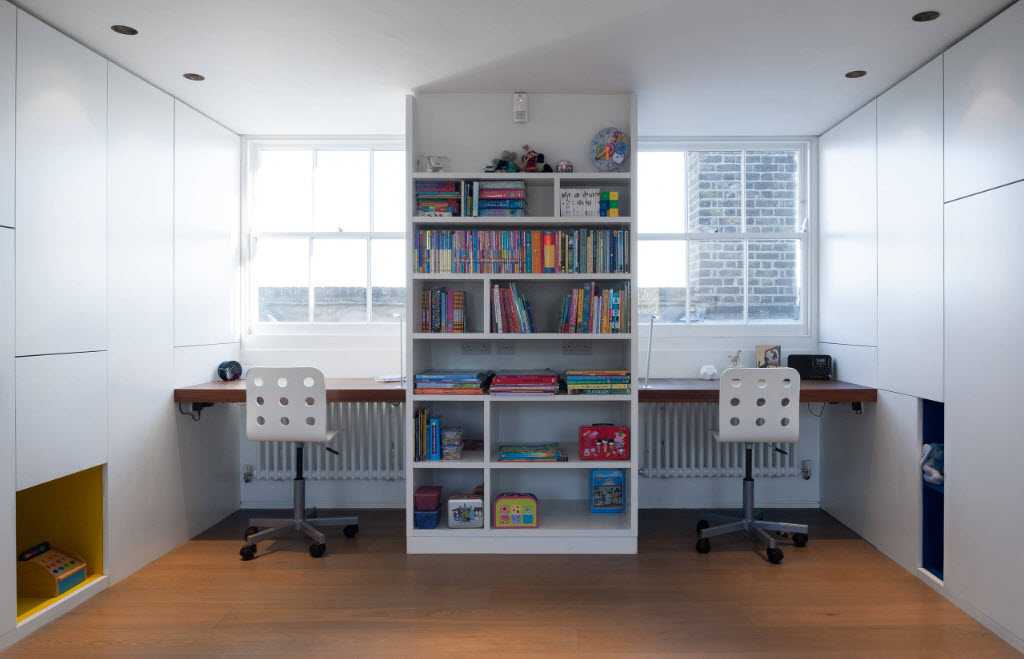 Перед вами пример организации рабочих мест в комнате, где проживают два ребенка. Письменные столы совместно с системами хранения встроены в большие шкафы, которые можно закрыть для освобождения наибольшего пространства для игр и занятий спортом. В подобных сооружениях основным моментом для пристального внимания родителей становится организации достаточной освещенности мест, которые не получают необходимого количества естественного света.