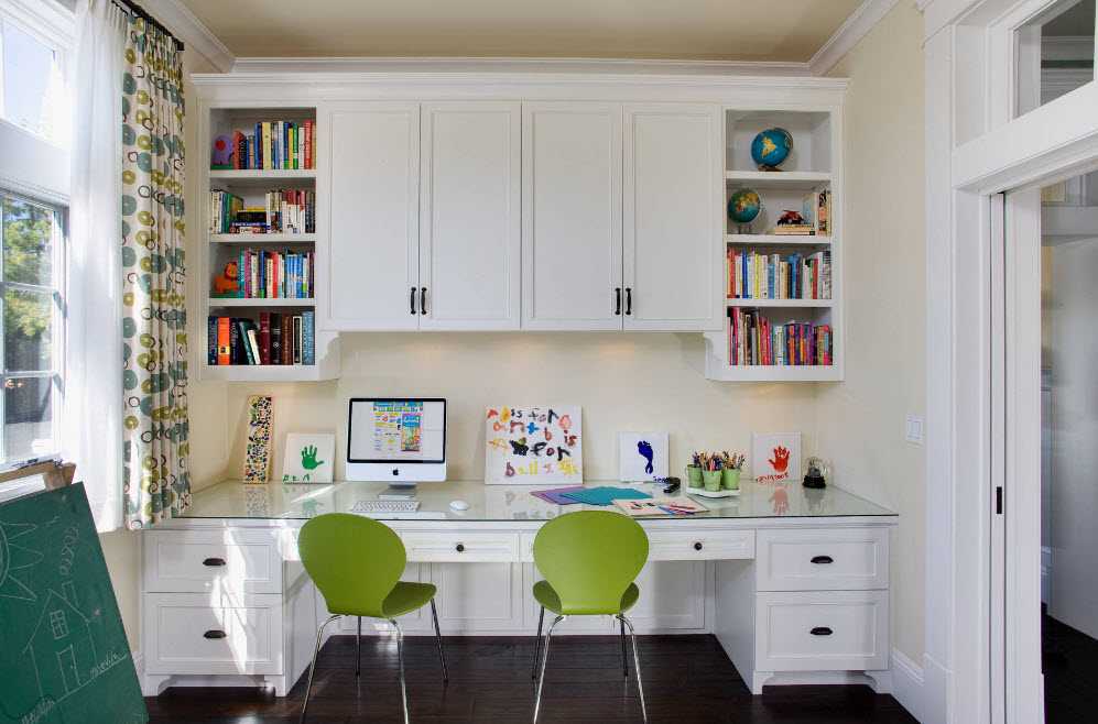 В некоторых случаях не лишним будет зонирование рабочих мест за одной общей столешницей не только системами хранения, расположенными под столом, но и над ним. Будут ли это открытые полки или распашные шкафчики – решать вам. В любом случае, систем хранения много не бывает, а многим детям просто необходимо иметь свой уголок для учебы и творчества, отделенный пусть и небольшим стеллажом.