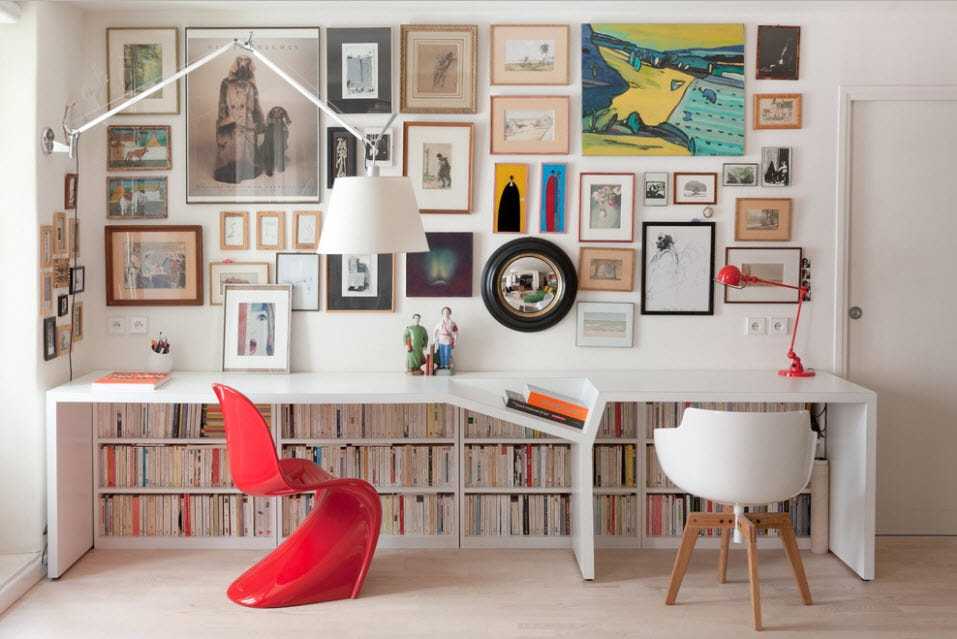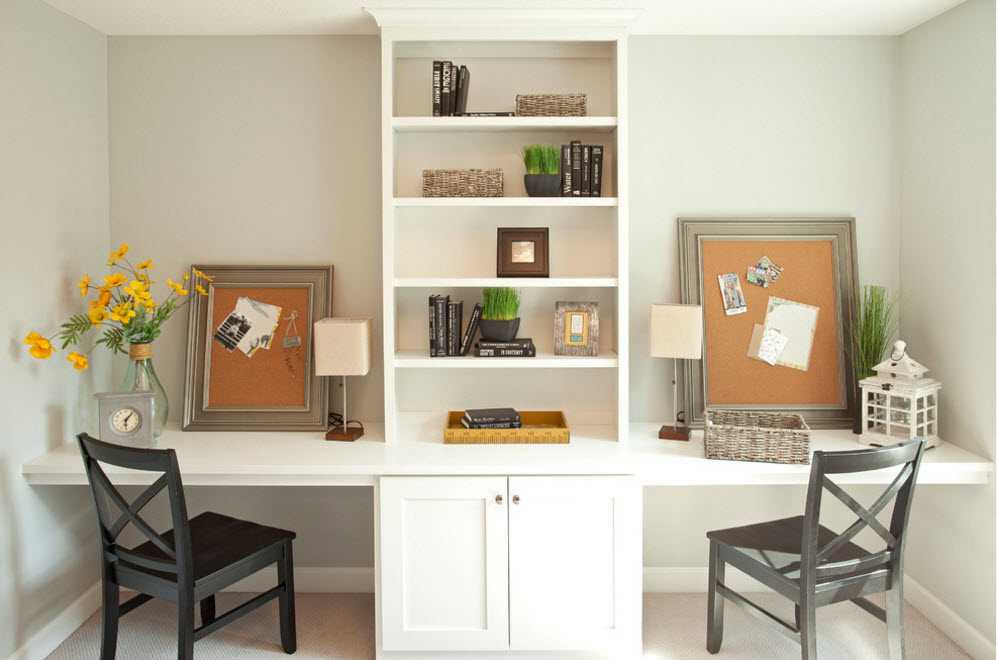 В продаже есть письменные столы, представленные в виде острова-куба, в котором выделено как минимум два рабочих пространства, каждое из которых оснащено индивидуальными системами хранения. Но для установки подобных модулей необходимо наличие достаточно просторного помещения, чтобы организовать подход к острову со всех сторон. В наших средних по размерам квартирах проще использовать традиционную модель расположения рабочих мест – у стены.