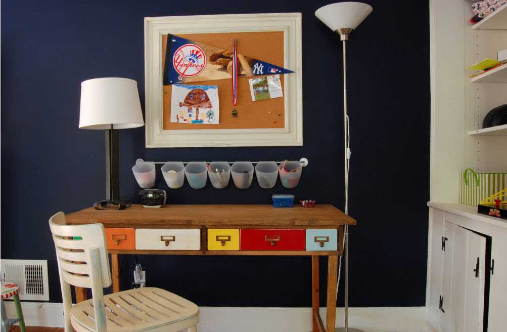 При организации рабочего места проявите немного креативности. Например, над столом можно повесить небольшую магнитную или деревянную доску. На неё можно крепить рисунки, картинки, календарики, фотографии, оставлять важные записки, мотивирующие послания и т. д. На открытых полках могут разместиться небольшие цветные коробочки или плетеные корзинки (зависит от стиля) для хранения различных мелочей.