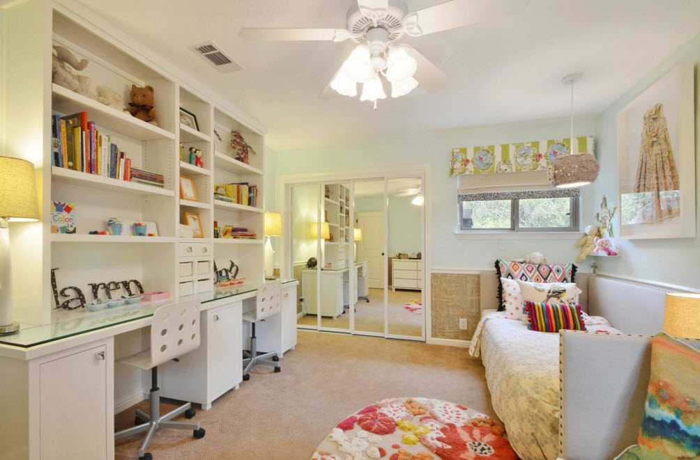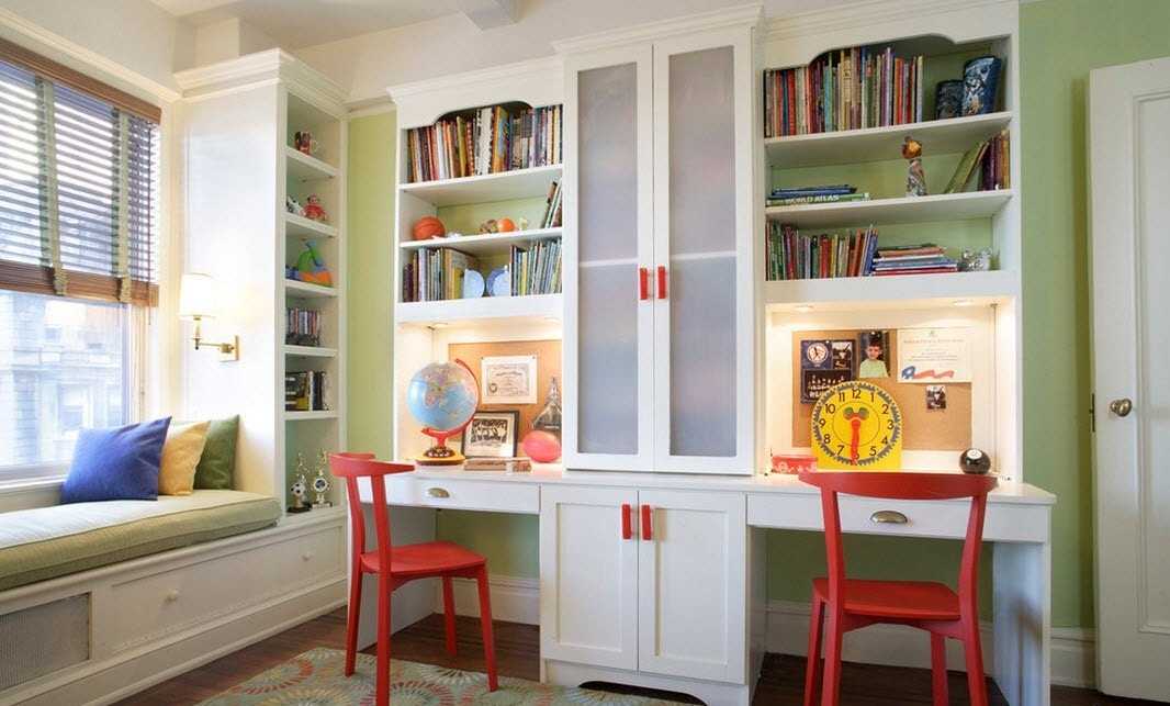 Обустроить детскую для одного ребёнка бывает сложно, а что уж говорить о комнате, в которой проживает 2-3 детей, особенно, если они разного возраста или пола. Оформляя комнату для ребят, лучше выбирать и располагать письменный стол во всю стену у окна. Существует несколько вариантов размещения рабочих мест для двух детей-школьников. При этом нужно помнить, что у каждого из детей должно быть достаточно свободного пространства для выполнения домашних заданий, работы на компьютере или занятий рукоделием.