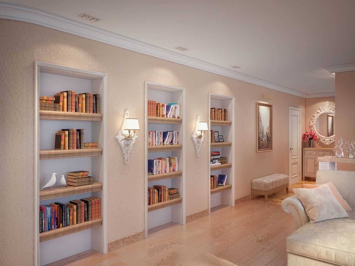 Встроенные стеллажи размещают в нишах стен. Это может быть открытая конструкция или полки, спрятанные за декоративным панно, зеркалом. Часто их встраивают в ниши гардеробных.