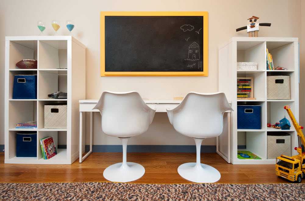 Если же пространство детской ограничено или дети отлично ладят, способны не отвлекать друг друга от занятий, то общая столешница, зонированная тем не менее с помощью систем хранения, расположенных под нею, может стать оптимальным вариантом.