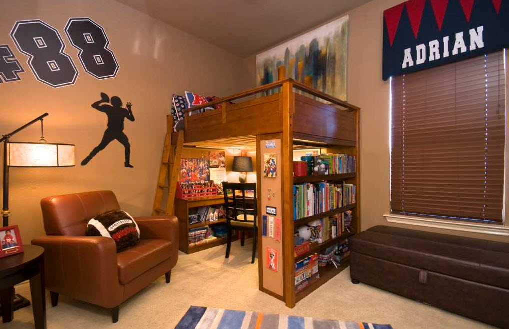 Многим родителям нравится планировка спального места в виде кровати-чердака, а в пространстве под нею размещение рабочего сегмента. Такая компоновка мебели экономит существенное количество полезного пространства детской комнаты, но рабочий стол в результате располагается в достаточно темном месте. Даже днем естественного освещения будет не хватать и придется использовать настольную лампу или встроенную подсветку. Вопрос экономии пространства особенно остро стоит в комнатах, где проживают два и более ребенка, но по возможности письменный стол необходимо выводить в зону, близкую к оконному проему.