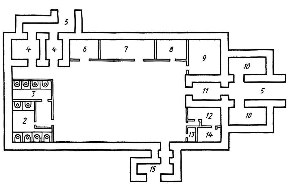 Это типовая схема советского бомбоубежища, они примерно одинаковые во всех городах. 7 — помещения для людей; 2, 3 — мужской и женский санузлы; 4 — тамбуры; 5 — входные шлюзы; 6 — складское помещение; 8 — кладовая для продуктов; 9 — фильтровентиляционная камера; 10 — расширительная камера; 11 — вход; 12 — дизельная электростанция; 13 — склад горюче-смазочных материалов; 14 — щитовая; 15 — аварийный выход