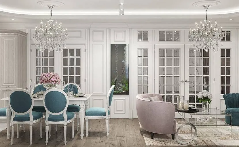 Идеальные исходные данные комнаты — простор, высокие потолки, правильная форма. Небольшие залы тоже оформляют в классическом стиле, правда работы будет гораздо больше.