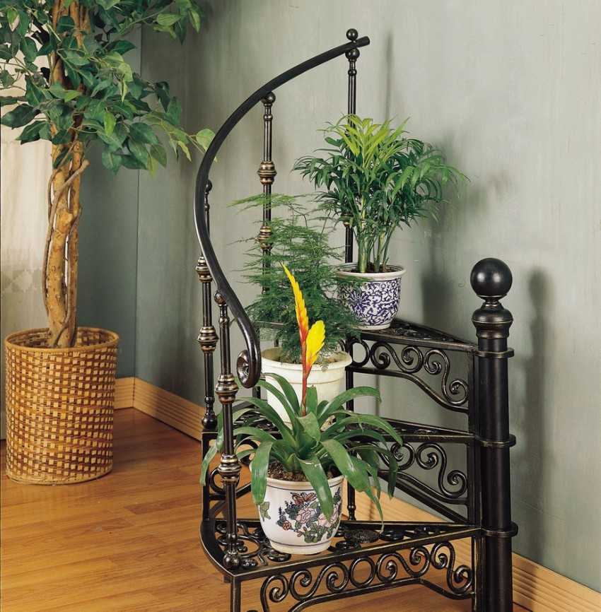 Напольные металлические подставки для цветов выполняют практически в любой форме, будь то спираль, горка, затейливый цветок или животное. Служат они крайне долго, особенностей в уходе не имеют, влаги не боятся (в том случае, если детали подставки покрыты нержавейкой).