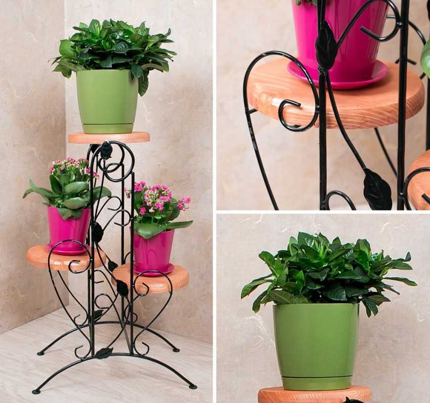Как и любая конструкция, стойка для цветов бывает сборная и цельная. Сборная стойка состоит из элементов, которые можно собрать и при желании разобрать. Преимущества такой вещи очевидны – легка в уходе, проста в транспортировке. Цельная подставка более прочна и надежда, нежели сборная, которая может потерять свою устойчивость при плохо скрепленных деталях. Однако, невозможность разобрать цельную стойку добавляют ей один большой минус – сложность в передвижении.