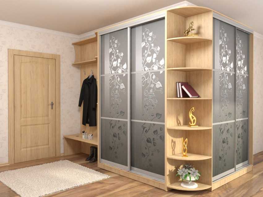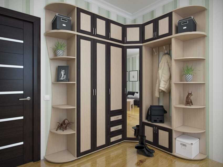 Просторный свободный угол — идеальное место для установки гардеробной. Это может быть напрямую скошенный угловой шкаф или выпуклой формы. Последний вариант практичней, внутри гардеробной образуется дополнительная площадь. Он эффектнее смотрится в дизайне интерьера прихожей, более эргономичная форма.