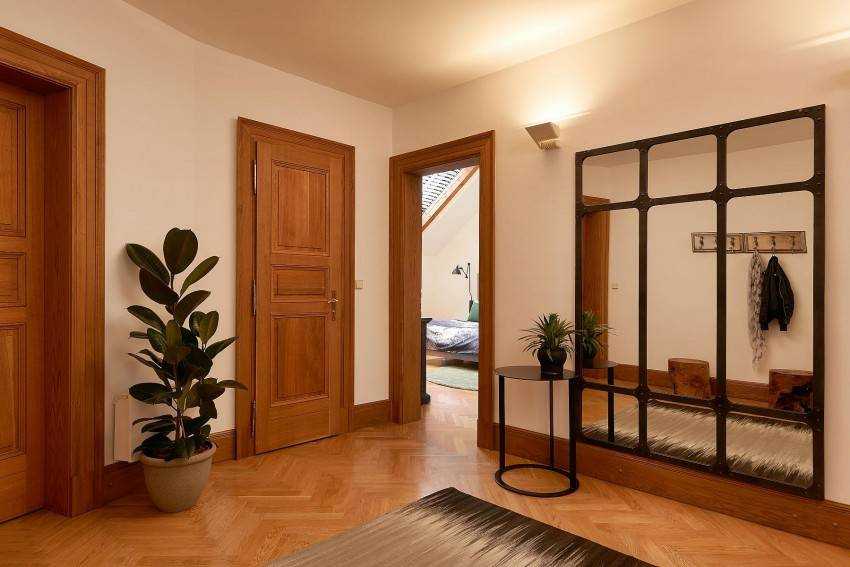 Для этого используют дверь, с внешней стороны которой находится зеркало. Выгодно подчеркнет преимущества интерьера, а также всей обстановки качественное освещение.