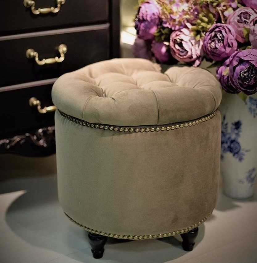 Для спальни выбирают мягкие прикроватные пуфики, оборудованные ящиком для хранения вещей или изделия со спинкой, которые размещают возле трюмо.