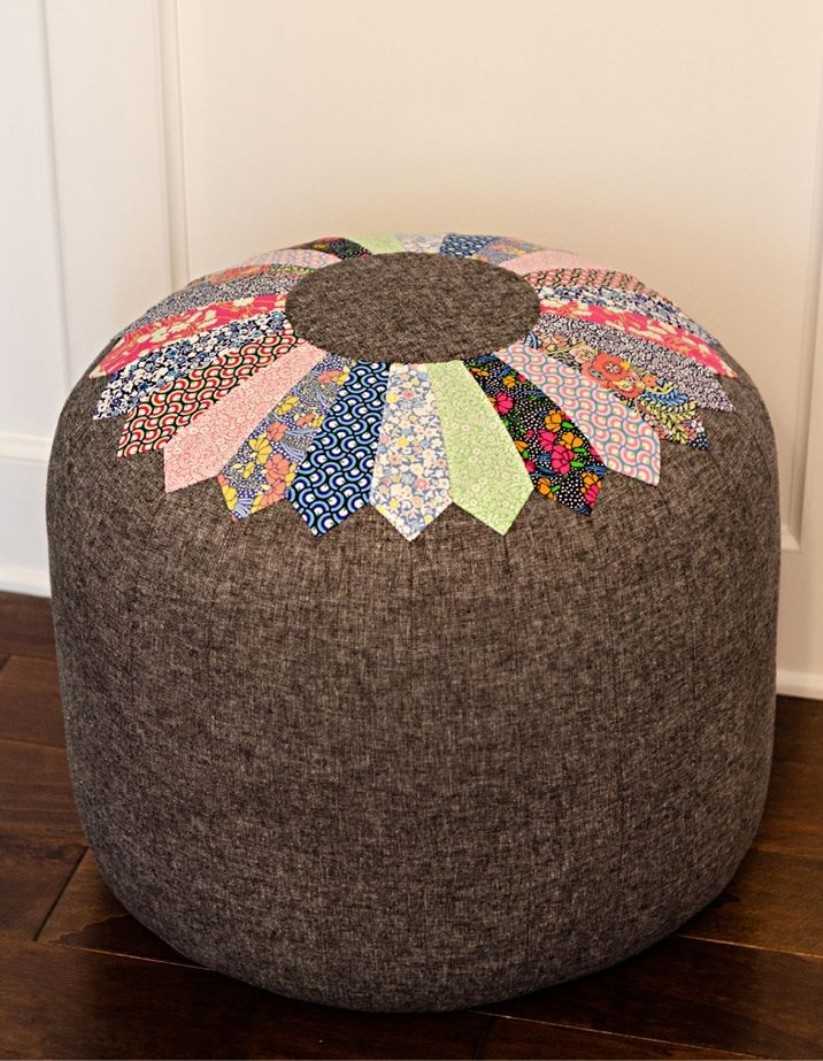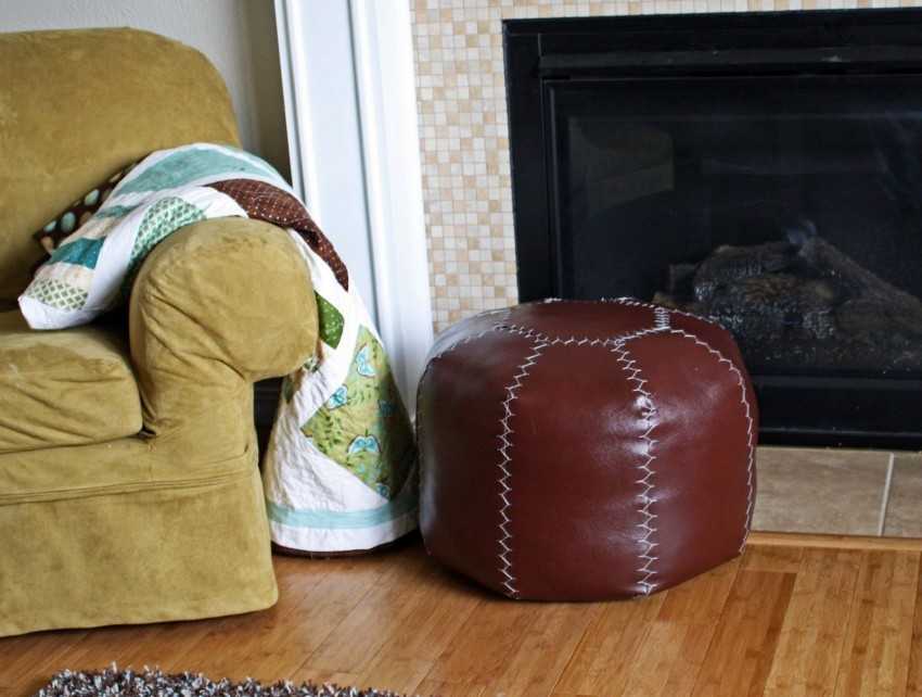 Вырезаем из ткани или кожи 2 круга/2 квадрата и прямоугольник, сшиваем их между собой и обтягиваем получившийся пуф.