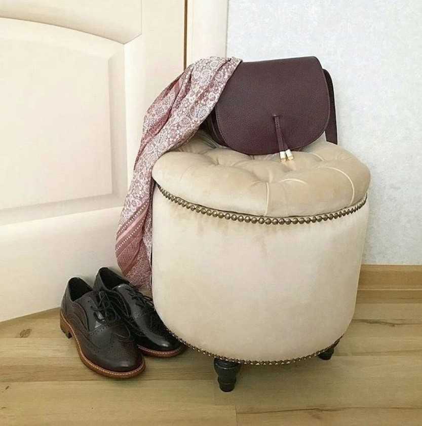Модель, предназначенная для прихожей, не должна быть брендовой, а поскольку прихожие страдают от нехватки свободного места, пуфику лучше иметь дополнительный функционал – ящик или полочки для обуви.