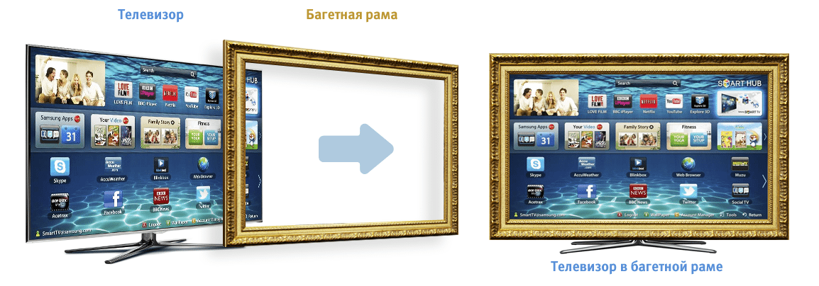 И вот уже багетные мастерские предлагают новую услугу — оформление телевизора в багетные рамки. Обрамление в багет помогает телевизору вписаться в интерьер и добавляет ему изысканности. Плазменная панель телевизора или цифровая фоторамка не меньше, чем картина и зеркало нуждаются в обрамлении в багетную рамку.
