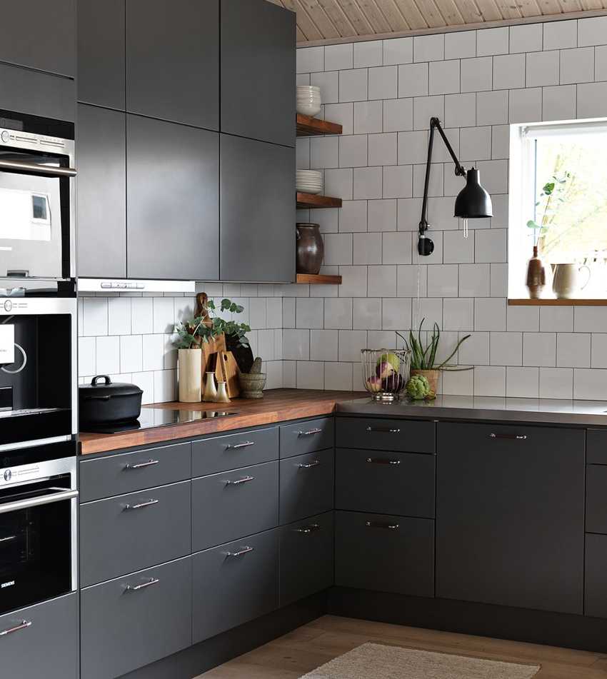 Графитовые стены с белым кухонным гарнитуром – решение для стильных, городских интерьеров. Кухня должна иметь площадь более 6 кв м, чтобы темный цвет отделки не создавал мрачного впечатления. Если места достаточно, пол оформляют в темных тонах, например, черной плиткой или деревом венге.
