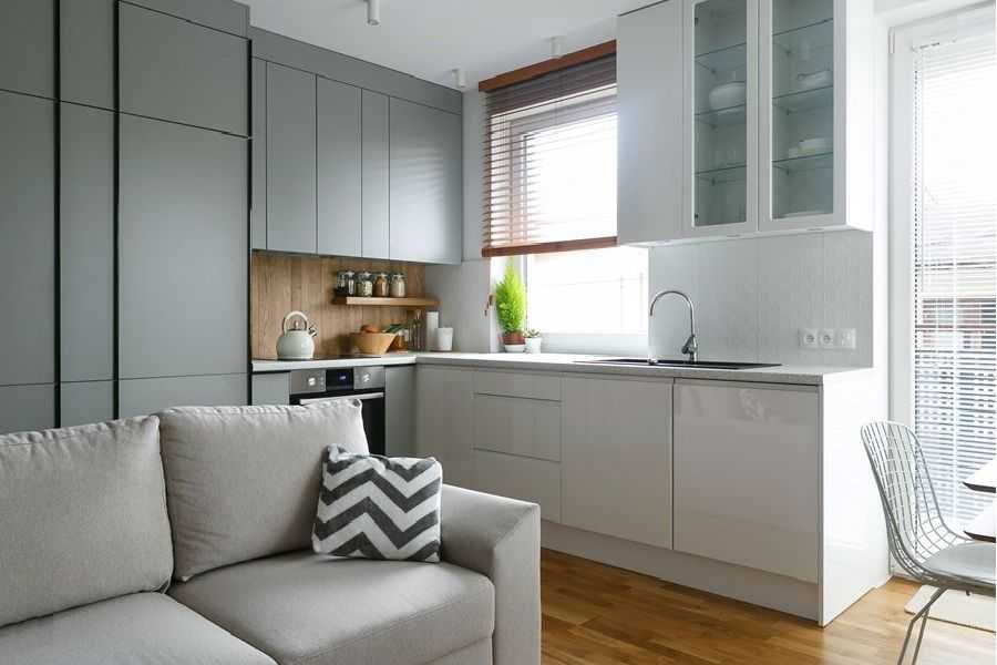 Как оформить небольшую кухню и скорректировать форму комнаты: фото интерьеров в сером цвете