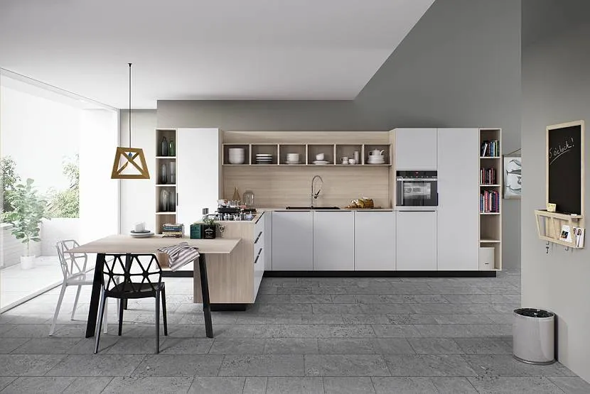 Светлые фасады белого кухонного гарнитура визуально увеличивают пространство, такой вариант выбирают для оформления небольших по размеру помещений. Серые стены могут иметь светлый, дымчатый оттенок, обстановка получится легкой, воздушной. Пол здесь оформляют плиткой или керамогранитом под бетон. Хорошо смотрится напольное покрытие из дерева сонома, а также молочная или янтарная древесная доска.