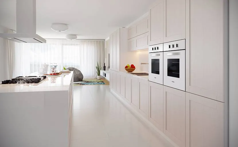 Кухня с белым гарнитуром в этом стиле обычно имеет гладкие фасады. Распространены чёрно-белые сочетания: это может быть чёрная плитка на полу и фартуке либо тёмная столешница.