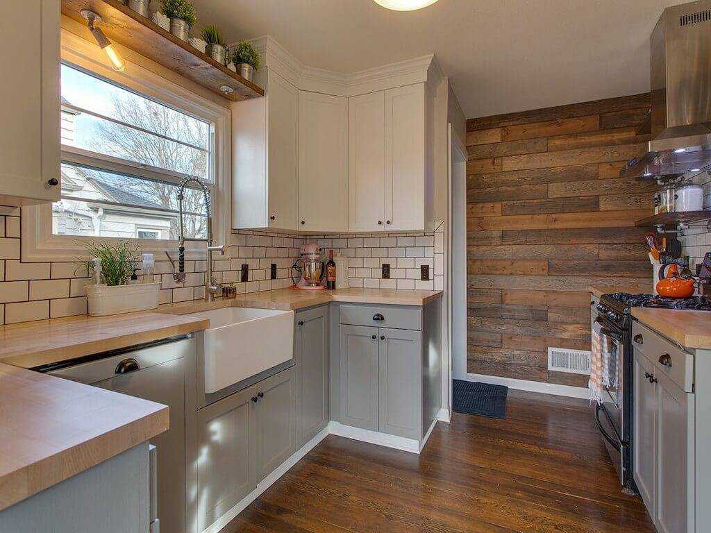 - Вытянутую форму комнаты легко исправить, применяя сочные оттенки серого для отделки боковых стен и более светлый тон для оформления других противоположных поверхностей. Если требуется, наоборот, отдалить стены в небольшой кухне, то используется обратный вариант.