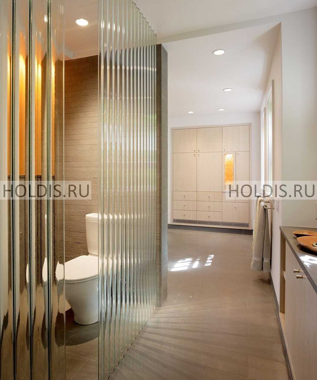 Для создания стеклянных перегородок используется специально закаленное стекло с высокими прочностными и долговечными свойствами. Конечно, такие конструкции стоят недешево, и для их монтажа необходимо будет обратиться к специалистам. Рифленое матовое стекло пропускает свет, но практически полностью скрывает происходящее за перегородкой. Такой дизайн станет практичным и функциональным дизайнерским решением для того, чтобы отделить ванную комнату от спальни. Похожие варианты стеклянных перегородок, но в раздвижной форме могут быть использованы, для того чтобы отделить кухню от столовой или гостиной.