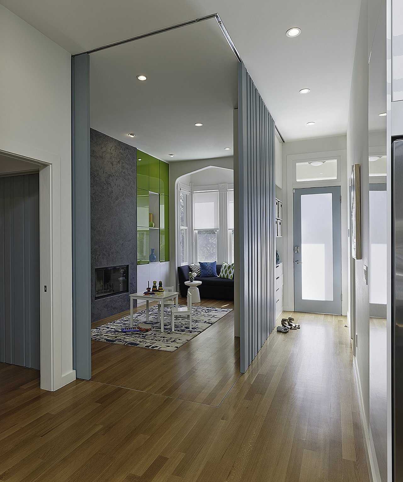 Еще один пример использования раздвижных дверей. В данном случае полупрозрачных.