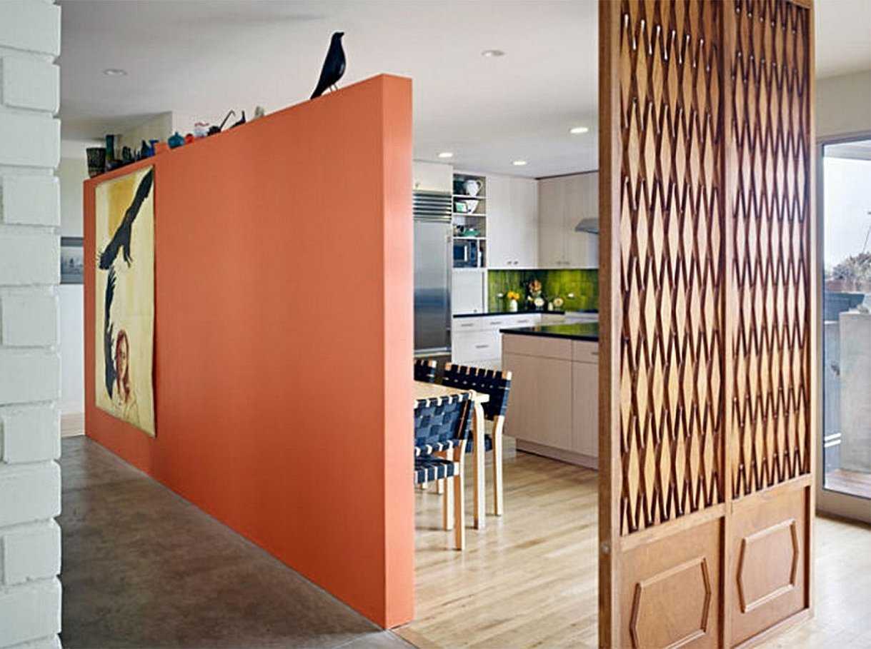Стена перегородка в интерьере в этих случаях позволяет оградить жильцов и гостей от лишних запахов и шума.