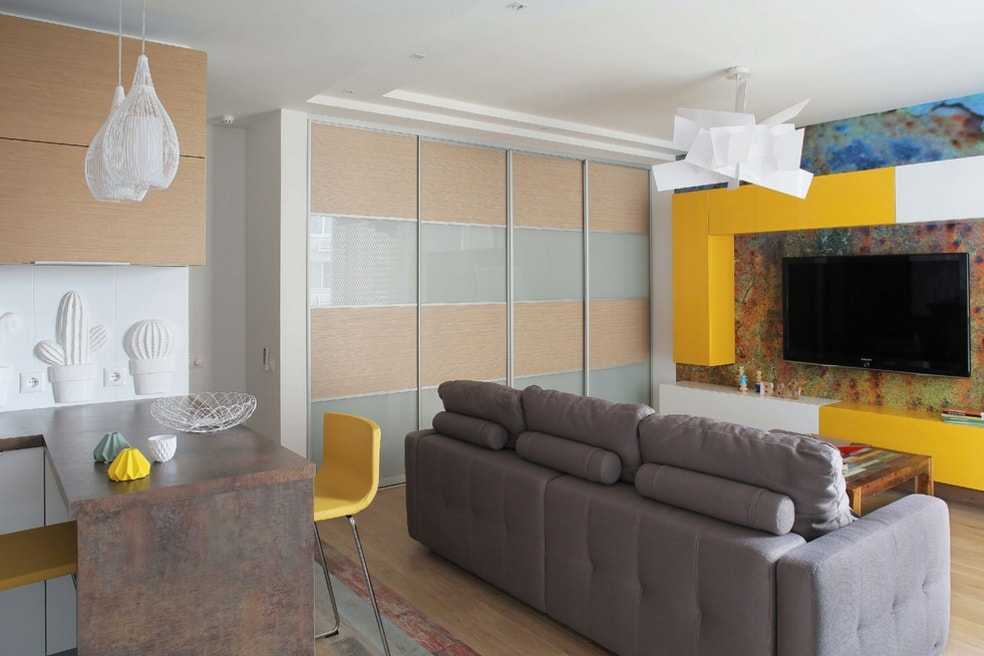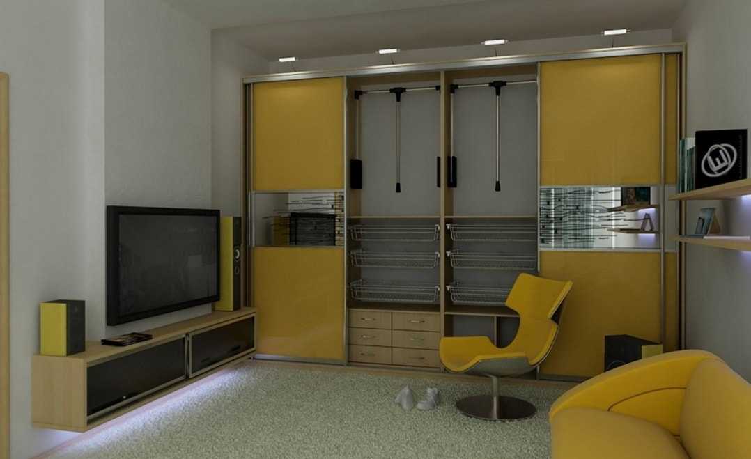 Желтый шкаф-купе безусловно понравится не каждому. Но если правильно расставить акценты, то даже такая яркая конструкция будет выглядеть уместно.