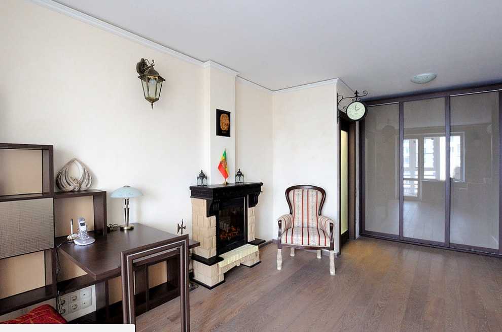 При наличии камина в гостиной, шкафы можно установить на прилегающей к нему стене