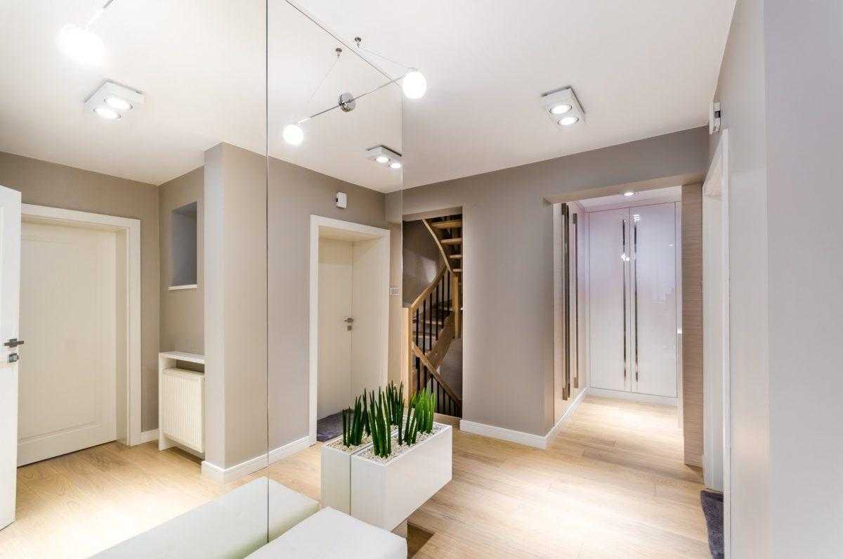 Прихожая с большими зеркалами и дизайнерским освещением.