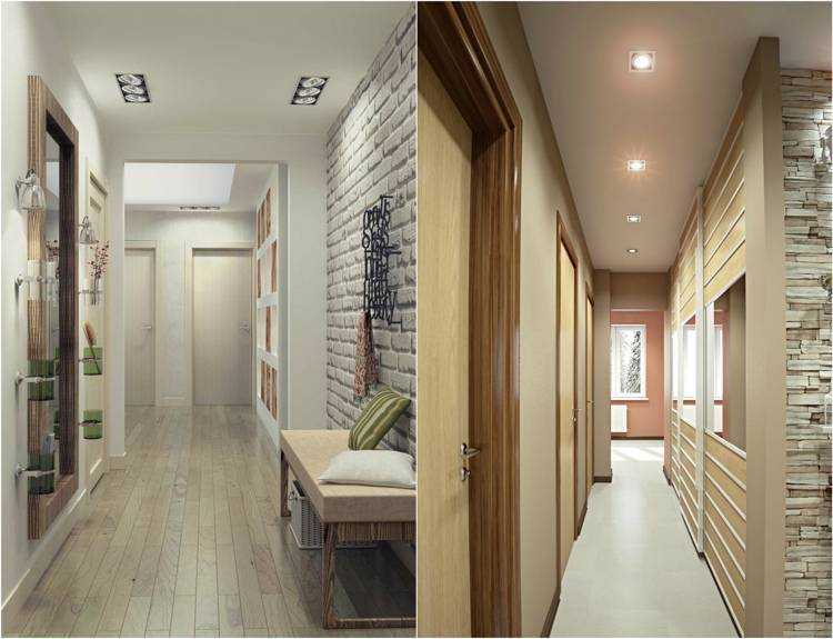 Дизайнеры предлагают зонировать узкие и длинные коридоры. Например, несколько метров около двери могут быть выложены плиткой или ламинатом одного оттенка, а на оставшуюся часть коридора использовать материал похожего, но другого оттенка. Допустимо делать и ступеньку, чтобы получился перепад высоты пола. Но это подходит не для всех помещений.
