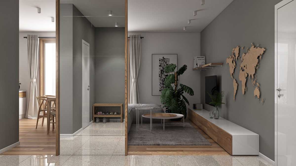 - Комната в серых тонах. Пол и стены в прихожей серые. Но оттенок стен немного светлее пола. Мебели должен быть минимум: открытая вешалка и обувница, которая внешне выглядит как пуф и сочетает в себе сразу две функции. Большое зеркало в рост добавляет света, зрительно увеличивает пространство и позволяет рассмотреть себя полностью без дополнительных сложностей.
