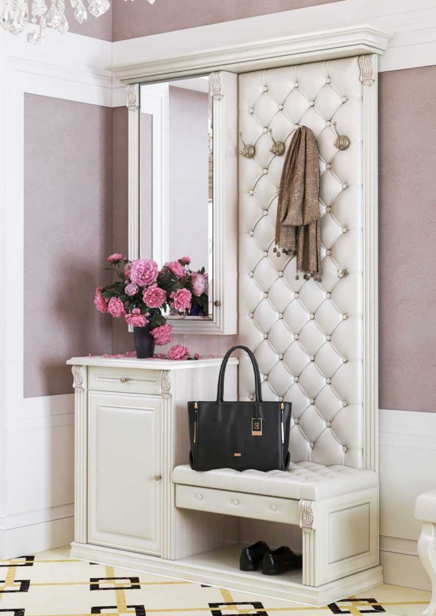 Дизайн мебели выбирается в зависимости от стиля интерьера квартиры. Если вы сторонник минимализма, идеальным вариантом в вашем случае станет белоснежная модульная конструкция, состоящая из матовых или глянцевых блоков. Для крючков в таких моделях используется хромированный металл. Дизайн максимально лаконичен, декор отсутствует. Многие варианты не ставятся на пол, а крепятся на стену, что делает обстановку изящной и воздушной.